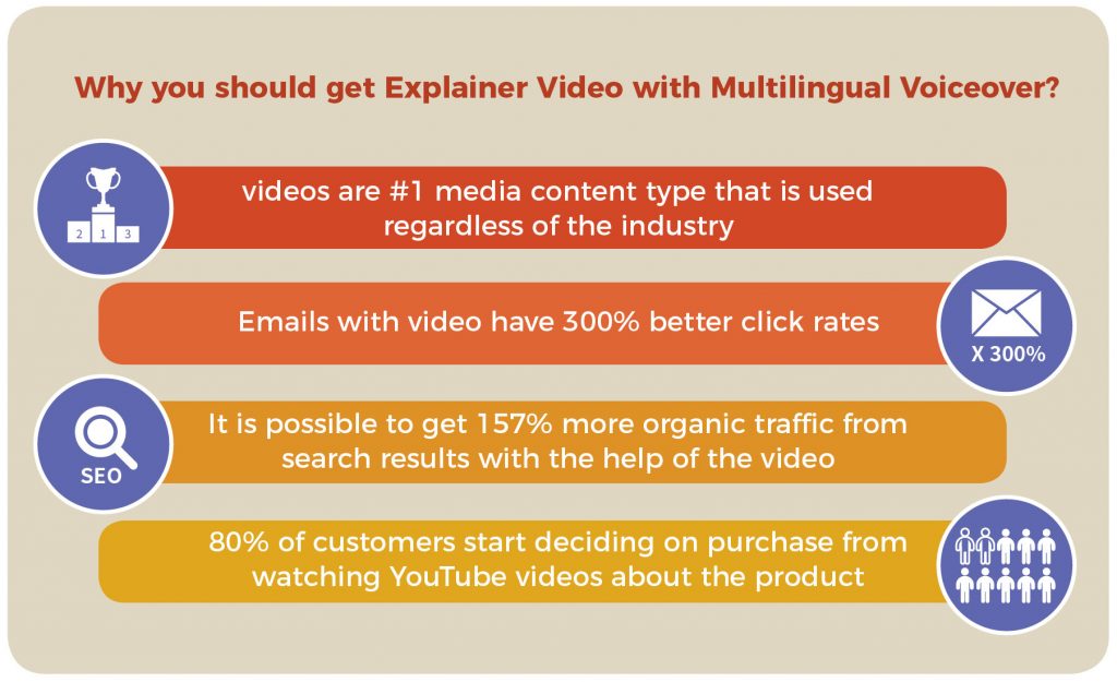 There is a huge market potential for providing explainer video in more languages. With the right team, explainer videos can be easily localized to foreign languages. To avoid incorrect audio which detracts from the user experience, localization partners must have internal multilingual language team to internally review the recording delivered for quality assurance prior to client delivery. Internal native speaker capabilities is a great advantage to strengthening the overall quality. Similarly, having a pool of talent available at all times will ensure that the project moves forward in a timely fashion without delay. A project manager will ensure that voice talents take into account the native language standards such as pace, tone, pronunciation, or words to be emphasized.