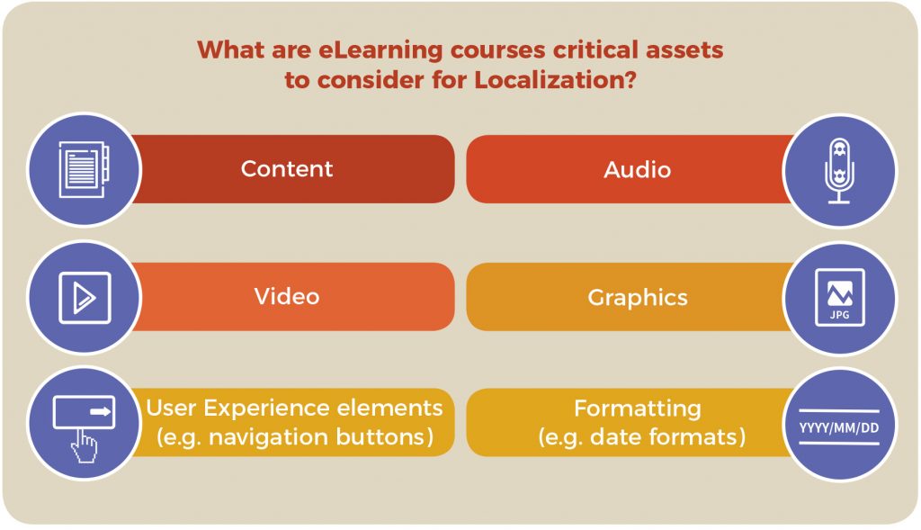 Technical considerations of diverse tools are crucial for successful localization since eLearning courses are now commonly developed on Learning Management Systems (LMS), while modifying forms and databases, standardizing date, measurement, currency formats, and other fundamentals and tools such as Adobe Captivate, Articulate Rise, Articulate Storyline, Lectora are considered as well. It may also require creating content design templates, foreign character sets, localizable assets such as slides, questionnaire, icons, navigation buttons voiceover recordings, etc.